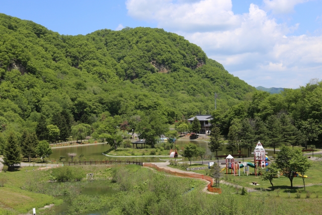 本別公園は緑豊かな自然に囲まれ、義経伝説の痕跡をたどる散策ができるほか、巨大アスレチックやボート、交通ルールを学びながら乗れるゴーカートなど子どもから大人まで一日中楽しめる公園です。