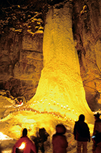 約28メートルの高さから一直線に落とされる山彦の滝。凍った滝をライトアップした姿はとても神秘的です。