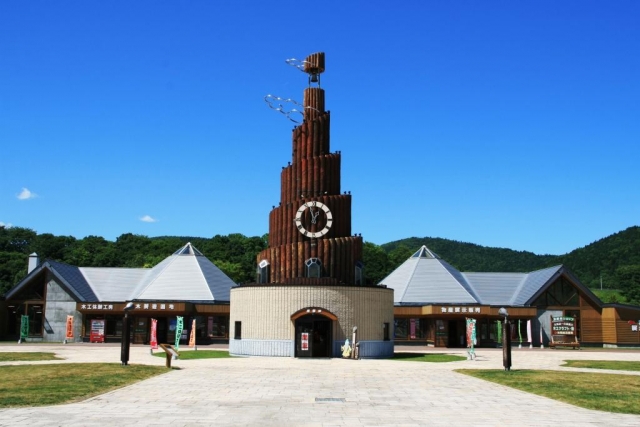 道の駅「おんねゆ温泉」のシンボルタワー。1時間毎に森の妖精がメロディーを奏でながら踊る姿にメルヘンの世界を思わせます。