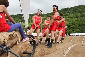 5人曳き、7人曳きのレースがあり、予選300kg、決勝500kgの丸太を積んだ鉄製そりを2つの障害のある全長80mのコースで全道から力自慢が集結し、曳き競いあう迫力あるレースです。