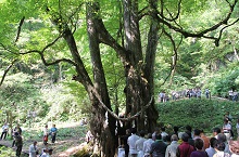 縁桂は2本の桂の木が結合した連理の木で、「触ると良縁に恵まれる」と地元の人々から崇められています。