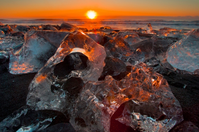 十勝川河口の太平洋岸に打ち上げられる十勝川の氷が朝日に照らされてまるで宝石のように輝いています。