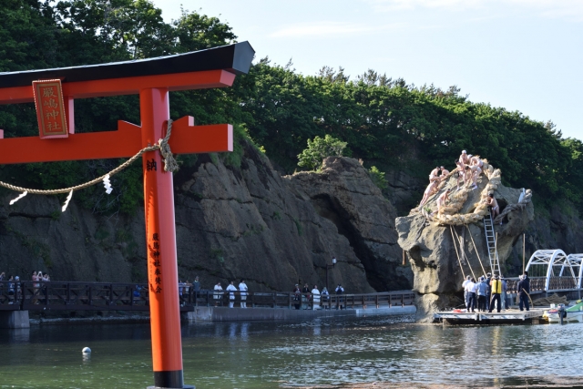 檜山道立自然公園のかもめ島を舞台に繰り広げられるかもめ島まつり。祭りのメインは江差の海の男たちが一丸となって行う瓶子岩しめ縄かざりです。