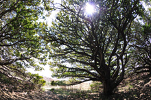高さわずか1メートルで、10mもの枝を広げるオンコ(イチイ)の老樹が広がる焼尻島の森。