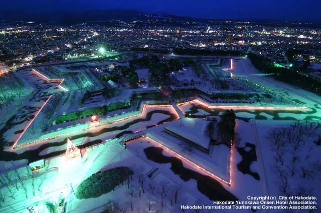 特別史跡五稜郭跡の堀の周囲にイルミネーションが輝き、星の形が浮かび上がります。