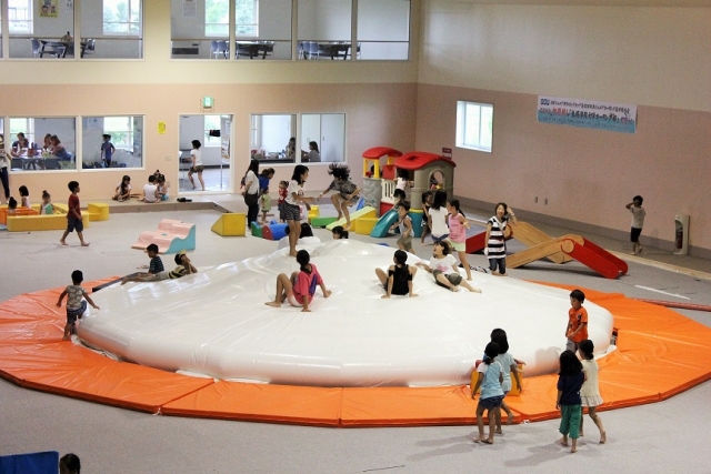 5月~9月中旬までは、屋内遊戯施設として子どもたちの遊び場に。ふわふわドーム、卓球台など