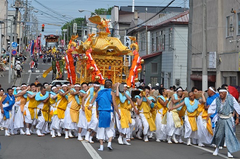 根室・金刀比羅神社の例大祭は、例年8月9から11日に市内巡幸が行われます。 神社行列のあと、市内4つの祭典区から繰り出される趣向を凝らした山車が笛太鼓、金棒、手古舞、子供神輿等と共に続き、約1kmにも連なる大行列となります。また9日・10日の夕刻より御旅所前にて行われる祭典区総出演による「音と力の競演」の熱演も、大勢の観客を魅了しています。 また、歩行者天国となった緑町通りには200を越す露店が溢れ、多くの人々で溢れます。 全市挙げてのお祭りは道内でも有名であり、明治21年に神輿巡幸が行われて以来、永い伝統を誇って現在も益々盛大に行われております。