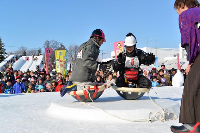 寒い冬、ジャンボ滑り台が子どもたちに大人気です。「冬鍋大会」や「国際中華鍋押相撲選手権」など各種ゲームが祭を盛り上げます。