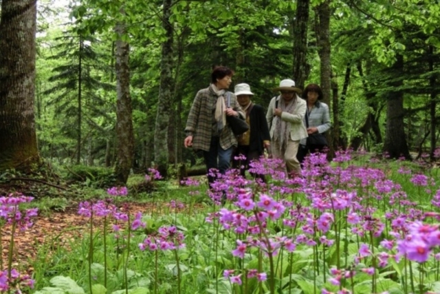 ノンノの森をピンクに染めるクリンソウの大群生の中で、森の音楽会や森林セラピーなどの体験ができます。