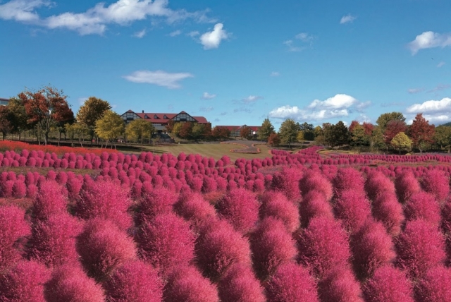 15箇所のテーマガーデンが広がる園内では、春にはグローリーオブザスノーやサクラ、初夏には紫のリナリアやバラが庭園を彩り、夏にはユリやアジサイ、秋にはコスモスが開花しいつ来ても違う花風景をご覧頂けます。また、夏の緑から秋の紅葉に様変わりするコキア(ほうき草)の丘が新たに登場し、10月の週末はライトアップもお楽しみ頂けます。