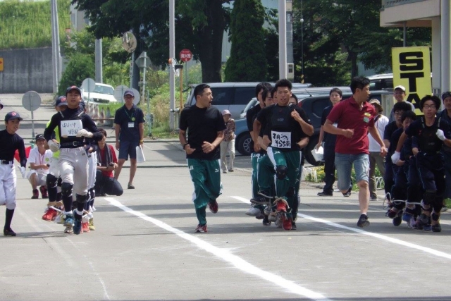 由仁町夏まつりの中のメインイベントである「ムカデ競走」は、大人6人がそれぞれロープで足を結び、100mを疾走する競技です。(一般男子決勝戦は150m。)